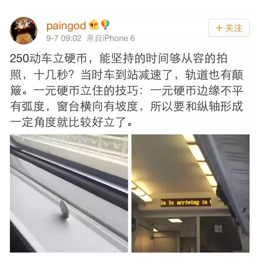 各路中國網友開始踴躍證明,用一元硬幣在高鐵上做起了立硬幣實驗(一元人民幣厚度是1.85毫米),結果硬幣依然傲然挺立,表示毫無壓力。