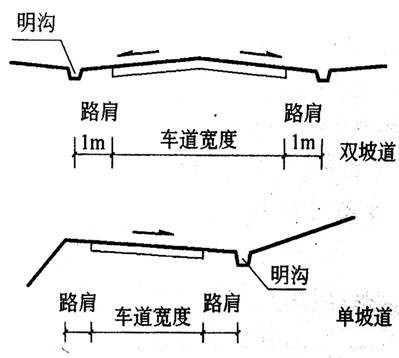 路面兩側(cè)不設(shè)高出的路緣石,而有保護路面的路肩,路肩外設(shè)明溝排除道路及兩側(cè)建筑用地的雨水;