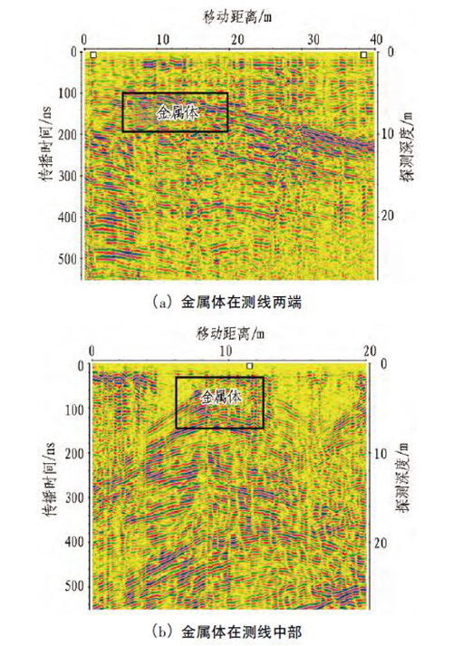 1) 地質(zhì)雷達(dá)探測(cè)時(shí)需將金屬物體移至測(cè)線(xiàn)外一定距離。對(duì)于會(huì)對(duì)探測(cè)結(jié)果產(chǎn)生干擾又無(wú)法移走的干擾體,應(yīng)詳細(xì)記錄其相關(guān)信息,包括干擾體的屬性與大小以及干擾體與測(cè)線(xiàn)的相對(duì)位置關(guān)系等,并通過(guò)信號(hào)處理從雷達(dá)圖像上識(shí)別或剔除干擾波,降低誤判率。
