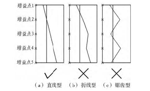 地質(zhì)雷達(dá)探測(cè)時(shí),電磁波由探測(cè)面向遠(yuǎn)處傳播,部分能量會(huì)被介質(zhì)吸收掉,反射波能量相應(yīng)減少。距離天線(xiàn)越近反射波能量越大,距離天線(xiàn)越遠(yuǎn)反射波能量越小,會(huì)在雷達(dá)圖像上反映出比較明顯的能量分層帶,越靠近探測(cè)表面信號(hào)越強(qiáng),遠(yuǎn)端信號(hào)較弱,因此,需要進(jìn)行增益調(diào)節(jié)來(lái)放大有效信號(hào)。正確的增益調(diào)節(jié)方式如圖8( a) 所示。增益調(diào)節(jié)的原則是保證增益點(diǎn)之間線(xiàn)性變化,同時(shí)應(yīng)使反射能量控制在一定的范圍。增益太大會(huì)造成削波現(xiàn)象,掩蓋有效信號(hào),增益太小有效信號(hào)不明顯,異常體位置不突出[14]。應(yīng)根據(jù)隧道的實(shí)際情況,將天線(xiàn)移至探測(cè)位置,采用先自動(dòng)后手動(dòng)的方法調(diào)節(jié)增益。