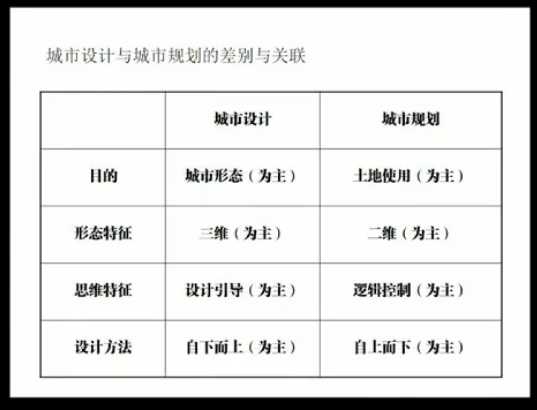 有答主拋出了莊宇老師對城市設計城市規劃差別的總結,我個人不能全盤接受。我認為是建筑學的思考方式。城市設計的尺度決定了城市設計的目的,所以以下這張表并不能相對準確的定義出城市設計與城市規劃的關聯,畢竟城市設計從總體城市層面到街道空間層面,存在太多的差異和關注點,如果是近人尺度的,或許會和莊老師的觀點更接近些。當然這是我一家言,觀點僅供參考。