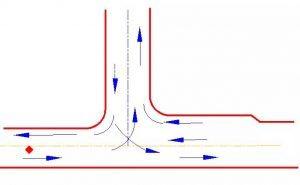 三路相交的交叉口,3個(gè)沖突點(diǎn)、3個(gè)合流點(diǎn)、分流點(diǎn)。