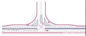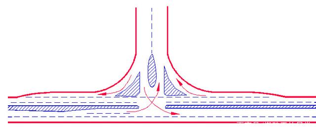 主要公路與次要公路的T形交叉,當(dāng)轉(zhuǎn)彎交通量較大而會(huì)導(dǎo)致直行車輛的過(guò)分減速時(shí),應(yīng)采用加寬式T形交叉左轉(zhuǎn)彎交通量較大者,可采用該型式。