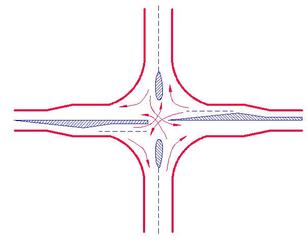 適當(dāng)布置交通島限制行車路線,使車流按一定組織方式通過(guò)交叉口,把沖突限制在一定范圍內(nèi);