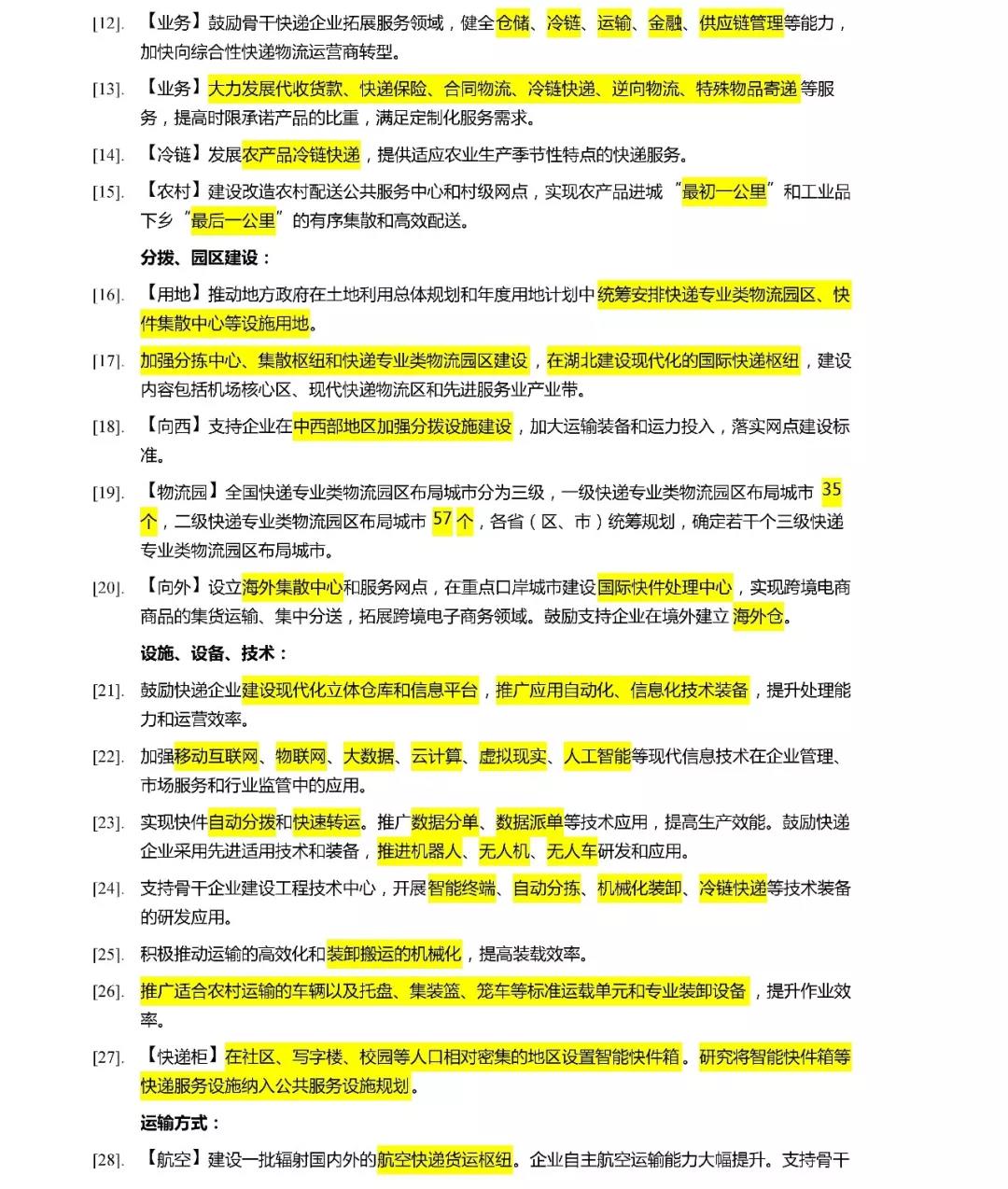 新增、擴(kuò)建、改造物流樞紐、分撥中心、快遞園區(qū)、國際處理中心、海外倉等重要基礎(chǔ)設(shè)施,內(nèi)部設(shè)備實(shí)現(xiàn)節(jié)能、環(huán)保、智能、信息化、自動(dòng)化。(具體數(shù)量地址等信息詳見后文詳情)
