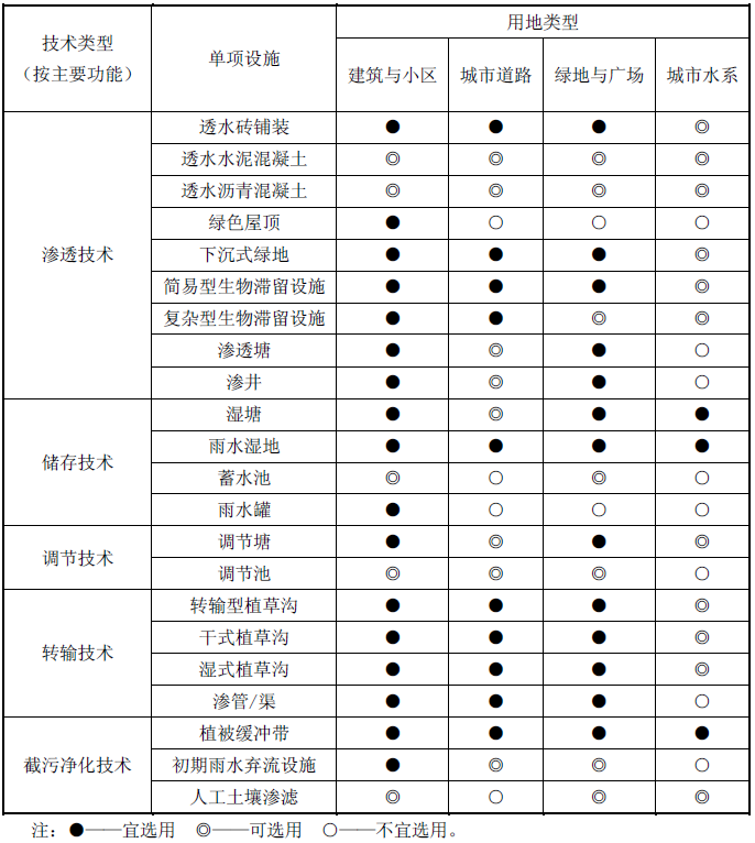 表1 各類用地中低影響開發(fā)設(shè)施選用一覽表