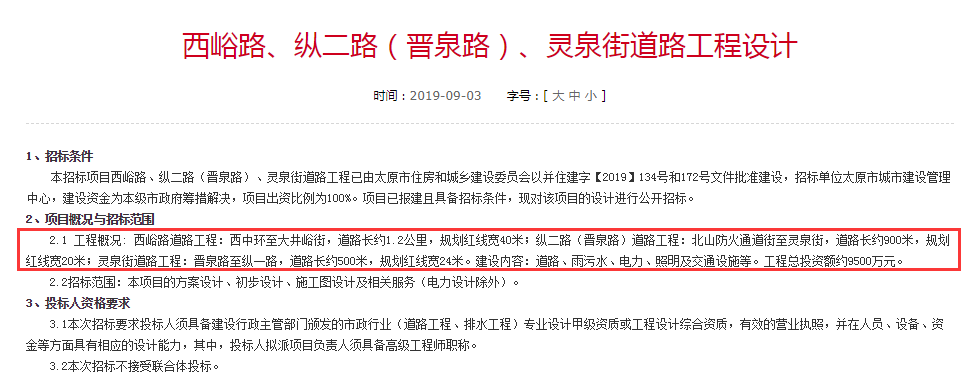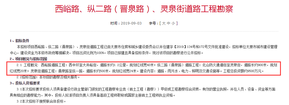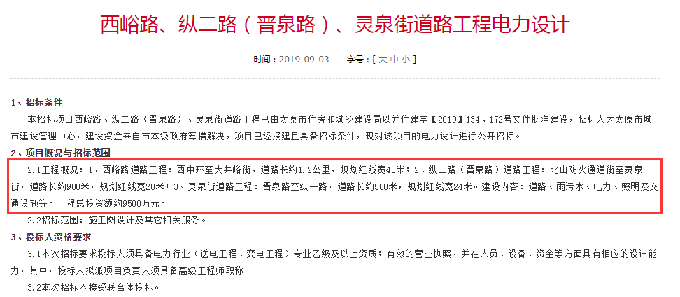根據(jù)招標顯示,本招標項目西峪路、縱二路(晉泉路)、靈泉街道路工程已由太原市住房和城鄉(xiāng)建設委員會以并住建字【2019】134號和172號文件批準建設,招標單位太原市城市建設管理中心,建設資金為本級市政府籌措解決,項目出資比例為100%。