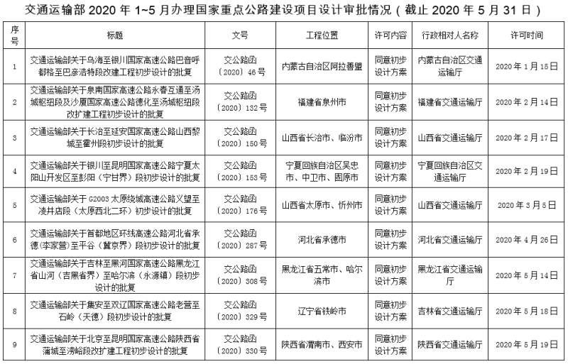 交通運(yùn)輸部2020年1~5月辦理國(guó)家重點(diǎn)公路建設(shè)項(xiàng)目設(shè)計(jì)審批情況(截止2020年5月31日)