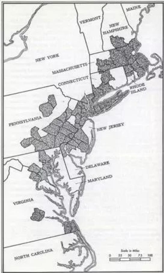 如今,規(guī)劃人員越來越多地談?wù)撆c交通、經(jīng)濟(jì)和環(huán)境有關(guān)的問題,而在規(guī)模上脫離了社區(qū)和城市,整個地區(qū)被多個地鐵連接在一起。不過,“大都市圈”的概念并不新鮮。這張1961年吉恩·戈特曼所著《大都市》一書中的地圖,展示了華盛頓特區(qū)東北部到波士頓一個連綿不斷的超大區(qū)。