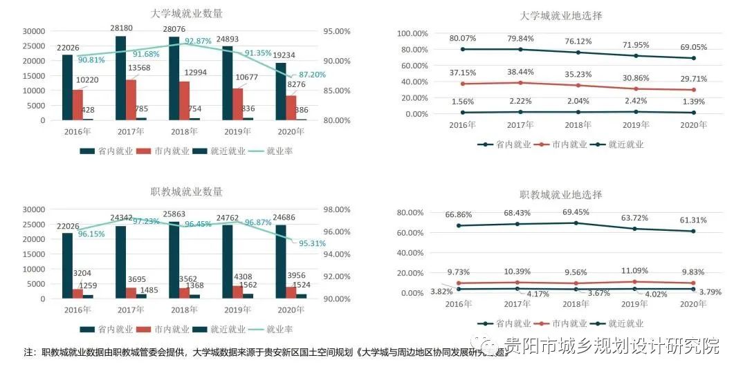 通過(guò)數(shù)據(jù)分析“兩城”在省內(nèi)、市內(nèi)及融合片區(qū)就近就業(yè)率,發(fā)現(xiàn)大學(xué)城畢業(yè)生近5年就業(yè)率穩(wěn)定在90%上下,省內(nèi)及市內(nèi)就業(yè)的比例逐年下降,就近就業(yè)率均不足3%。職教城畢業(yè)生近5年就業(yè)率穩(wěn)定在95%以上,省內(nèi)就業(yè)率在60%-70%,市內(nèi)就業(yè)率在10%左右,就近就業(yè)率均不足5%。