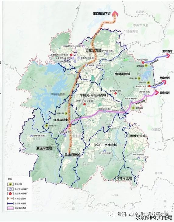 尾水收集:已建馬場(chǎng)至湖潮至南明河的貴安尾水通道,規(guī)劃沿紅楓湖、百花湖新建環(huán)湖綜合管廊,收集沿線朱家河、馬場(chǎng)、高峰、金華等10座污水處理廠尾水,排放至百花湖下游,減輕污水尾水對(duì)紅楓湖及百花湖的污染,排放標(biāo)準(zhǔn)為準(zhǔn)Ⅳ類水,計(jì)劃遠(yuǎn)期建設(shè)完成。新增金竹環(huán)阿哈湖南部截污管廊、大凹尾水通道,尾水采取跨流域排放模式,分別排放至市西河及南明河,減輕污水尾水對(duì)阿哈湖的污染,排放標(biāo)準(zhǔn)為準(zhǔn)Ⅳ類水,計(jì)劃近期建設(shè)完成。