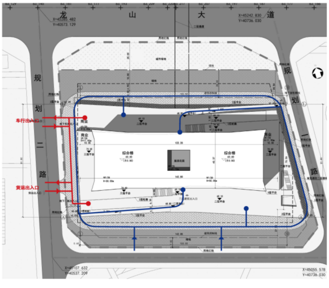 ②商業(yè)及三層辦公流線:由南北兩側(cè)主入口經(jīng)過入口大廳進(jìn)入首層,通過豎向交通,通往商業(yè)及三層辦公各層;也可以通過兩個室外坡道先上至二層平臺再通過二層入口大廳進(jìn)入二層。