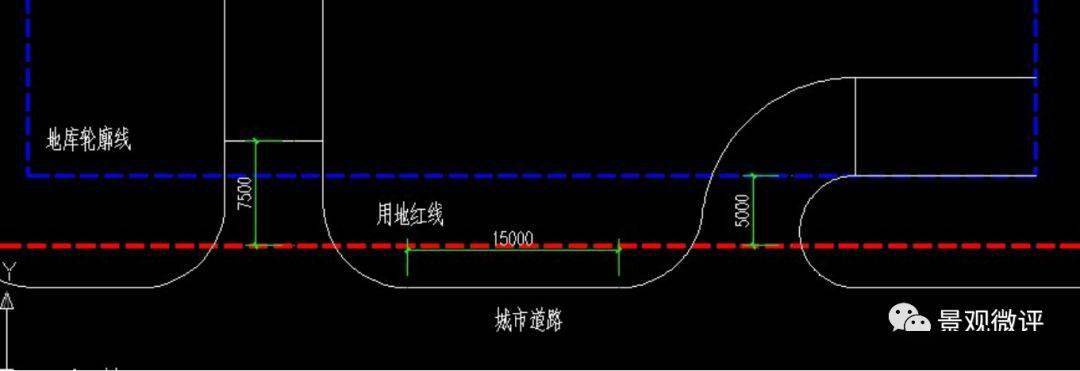 3)機(jī)動(dòng)車(chē)停車(chē)庫(kù)的出入口的坡道終點(diǎn)面向城市道路時(shí),其與城市道路紅線(xiàn)的距離不應(yīng)小于7.5m,平行城市道路或與城市道路斜交角度小于75度時(shí)應(yīng)后退基地的出入口不小于5.0m