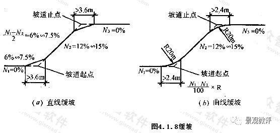 坡度超多10%時(shí),坡道上下端應(yīng)設(shè)1/2坡度的緩坡 (直線(xiàn)緩坡 3.6米長(zhǎng),曲線(xiàn)緩坡 2.4米長(zhǎng))