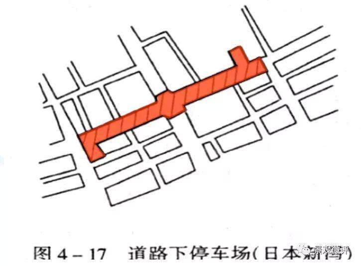 曲線(xiàn)形坡道占地面積小,適用于狹窄地段,視線(xiàn)效果差,進(jìn)出不太方便,圖4-36(d)、(e)