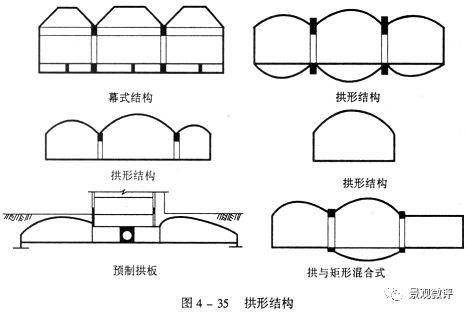 拱形結(jié)構(gòu)有單跨、多跨、幕式及拋物線(xiàn)拱、頂制拱板等多種類(lèi)型