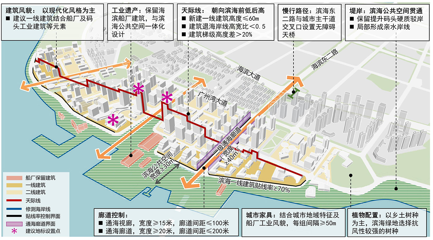 管控要點:結合船廠工業遺產,垂直海岸線控制多條通海廊道。控制新建一線建筑高度≤60m,建筑退海岸線高寬比<0.5,建筑梯級高度差> 20%,形成由濱海向內陸前低后高的天際線。
