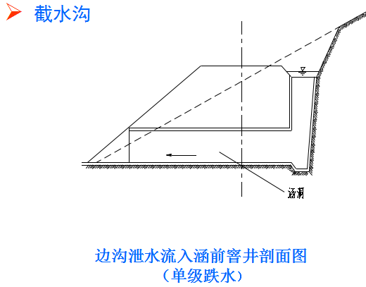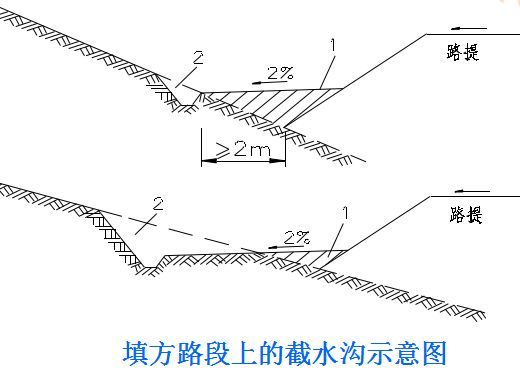 2.截水溝:又稱天溝,一般設(shè)置在挖方路基邊坡坡頂以外,或山坡路堤上方的適當(dāng)?shù)攸c(diǎn),用以攔截并排除路基上方流向路基的地面徑流。