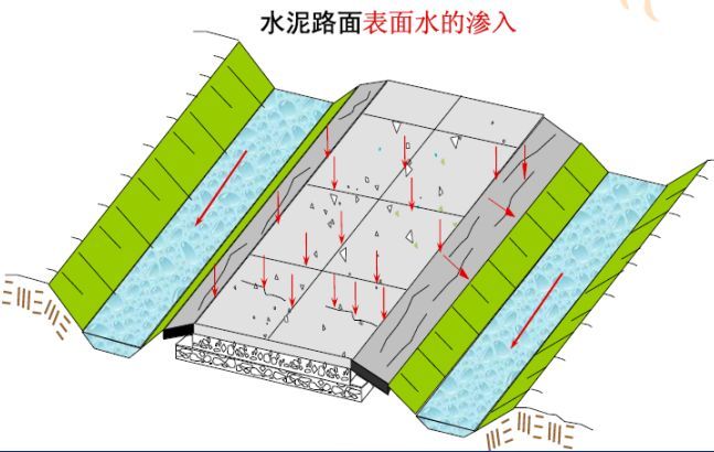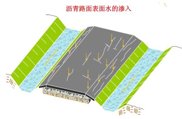 路面結(jié)構(gòu)內(nèi)部水的危害:浸濕各結(jié)構(gòu)層材料和路基土,易造成無(wú)粘結(jié)粒狀材料和地基土的強(qiáng)度降低;使水泥混凝土路面產(chǎn)生唧泥,隨之出現(xiàn)錯(cuò)臺(tái)、開裂和整個(gè)路肩破壞;進(jìn)入空隙的自由水在行車荷載的作用下,會(huì)形成高孔隙水壓力和高流速的水流,引起路面基層的細(xì)顆粒產(chǎn)生唧泥,結(jié)果失去支承;在冰凍深度大于路面厚度的地方,高地下水位會(huì)造成凍脹,并在凍融期間降低承載能力;水使凍脹土產(chǎn)生不均勻凍脹;與水經(jīng)常接觸將使瀝青混合料剝落,影響瀝青混凝土耐久性和產(chǎn)生龜裂。