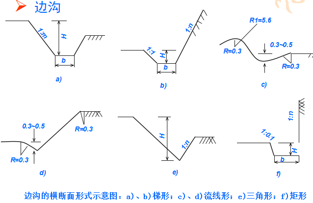 橫斷面:一般為梯形,溝的邊坡坡度,因巖土條件而定,一般采用1:1.0~1:1.5。溝底寬度b不小于0.5m,溝深h按設(shè)計(jì)流量而定,亦不應(yīng)小于0.5m。