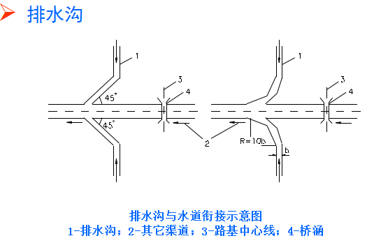 (3)排水溝水流注入其他溝渠或水道時(shí),應(yīng)使原水道不產(chǎn)生沖刷或淤積。通常應(yīng)使排水溝與原水道兩者成銳角相交,交角不大于45?,有條件可用半徑R=10b(b為溝頂寬)的圓曲線朝下游與其它水道相接。