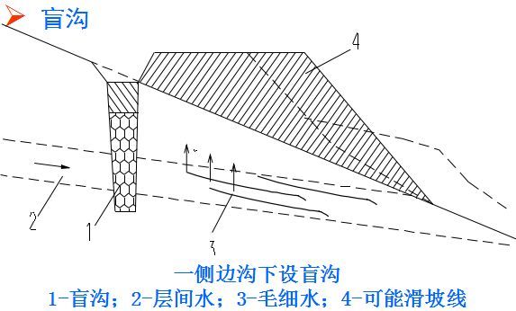 7.盲溝:相對(duì)于地面排水的明溝而言,盲溝又稱為暗溝,是一種隱蔽工程。在溝內(nèi)填以大小不同的顆粒材料,利用滲水材料的透水性將地下水匯集與溝內(nèi),并沿溝排泄至指定地點(diǎn)。