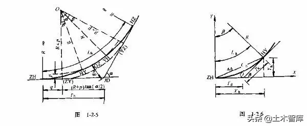 采用圓心不動的平行移動方法,可以看成是平曲線在未設置緩和曲線時的圓曲線半徑為R+p,而該平曲線要插入緩和曲線,向內移動距離P后,圓曲線半徑正好減小一個P值,即為R,如圖1-2-5所示。