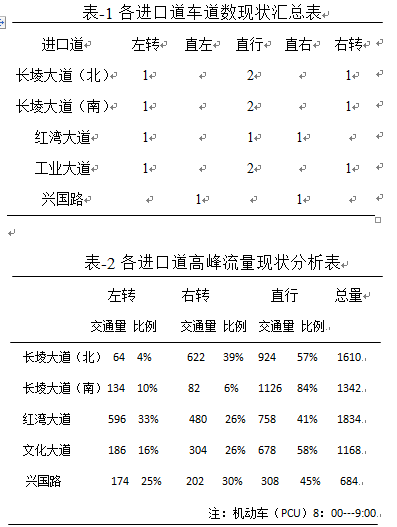 該交叉口各進口道車道設置和流量現狀表-1和表-2所示。由表-2可知,長堎大道和紅灣大道交通流量較大。實際調查中大中型車輛所占比例達到30%左右均集中在長堎大道和紅灣大道。
