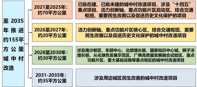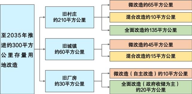 《專項規(guī)劃》統(tǒng)籌新增用地與存量用地資源配置,規(guī)劃至2025年,累計推進城市更新約130平方公里(含城中村改造70平方公里);至2030年,累計推進城市更新約230平方公里(含城中村改造120平方公里);至2035年累計推進城市更新約300平方公里(含城中村改造155平方公里),通過微改造、混合改造、全面改造多種方式并舉,推動低效存量土地的盤活再利用。