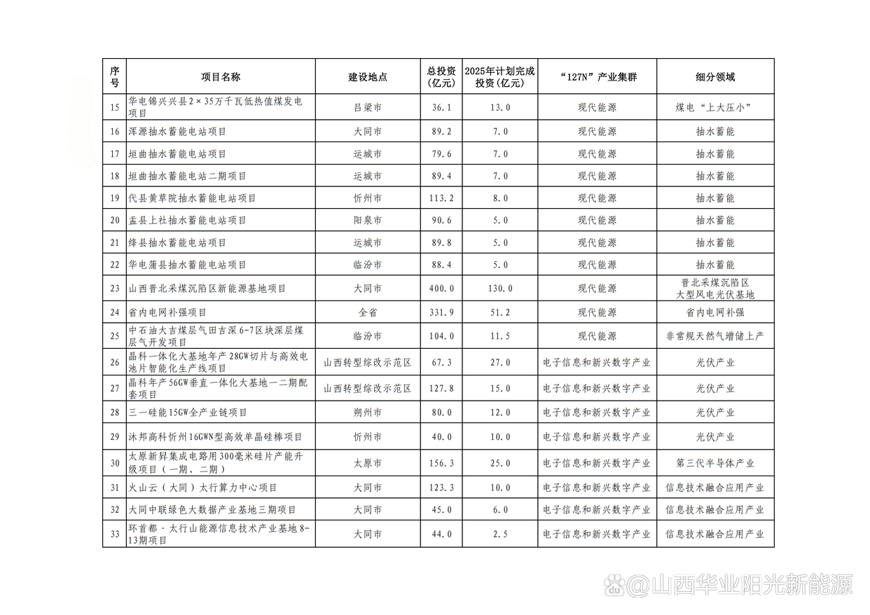 2.山西晉北新能源基地項(xiàng)目(含湖東“上大壓小”、同熱三期、風(fēng)電光伏3個(gè)子項(xiàng)目),總投資553億元,年度計(jì)劃投資169.8億元,建設(shè)地點(diǎn)大同市。