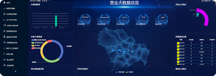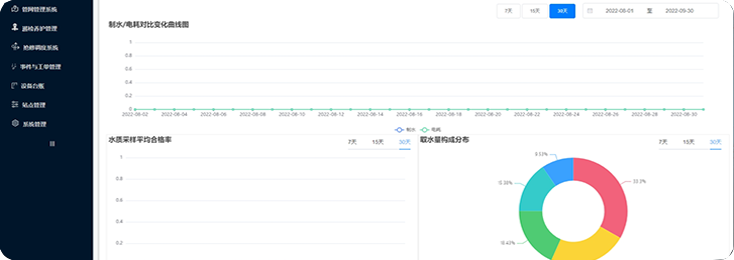 取水分析、消耗產出、水質分析、水壓分析、運營分析、設備統計